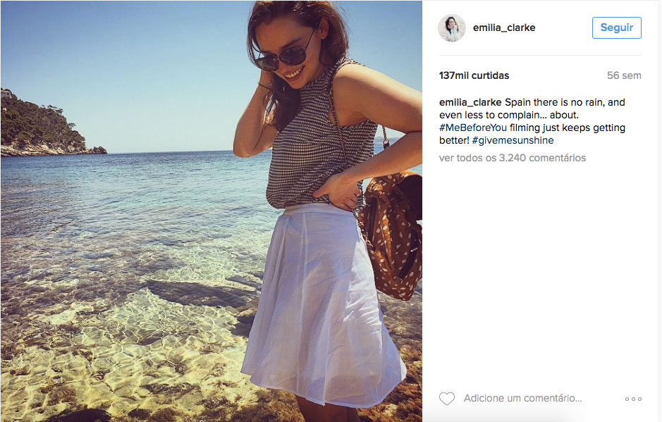 Emilia Clarke estava tão ansiosa pelas filmagens em Mallorca que postou em sua conta do Instagram uma foto do set de filmagens em um dia ensolarado com a seguinte legenda: “Espanha não tem chuva, e menos ainda sobre o que reclamar”. Parece que nossa musa de Game of Thrones adorou sair um pouco do verão chuvoso de UK.