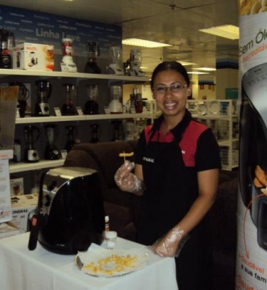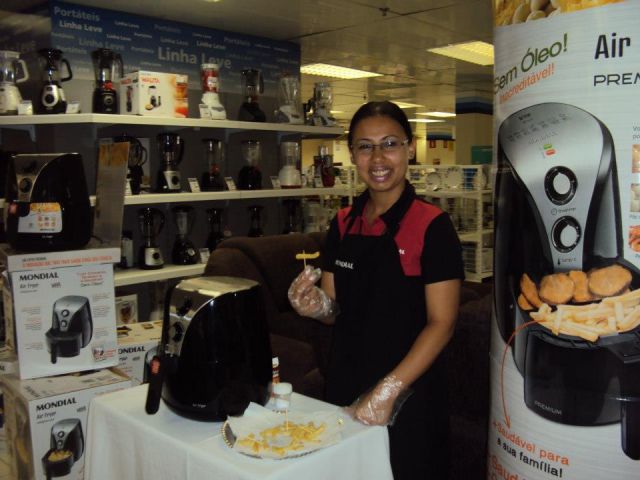 abordagem,demonstraçao e degustaçao de uma fritadeira eletrica sem oleo da marca mondial