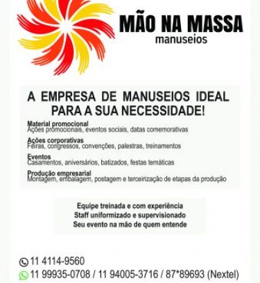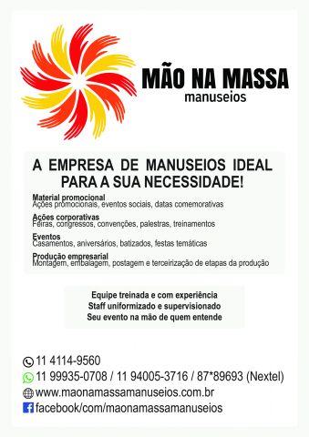 Mão na massa manuseio de materiais oferece as ferramentas para a execução das mais originais idéias na distribuição de Brindes e materiais para ações promocionais, coorporativas, festas, datas comemorativas e eventos em geral.