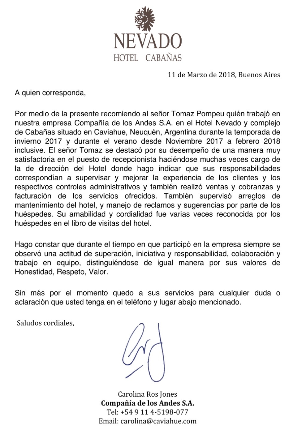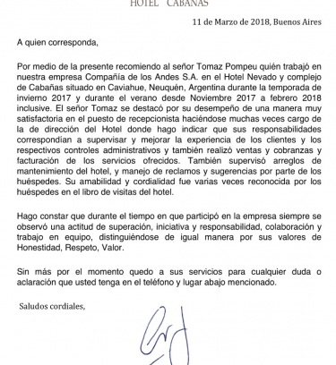 Meu mais recente trabalho foi na Compañia De Los Andes, no Hotel Nevado na Patagônia Argentina, onde exerço o cargo de guest relations e assistente de gerente.